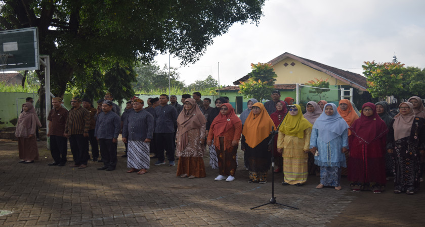 Upacara berlangsung di lapangan sekolah dengan latar belakang bangunan khas pedesaan yang asri, diiringi cuaca cerah yang menambah kesakralan acara. Tidak hanya guru perempuan yang mengenakan kebaya, guru laki-laki pun turut meramaikan dengan mengenakan pakaian adat Jawa seperti beskap dan blangkon, memperlihatkan kolaborasi dan solidaritas dalam memperingati hari besar nasional ini.